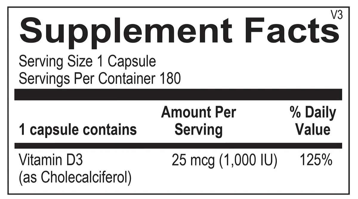 The Vitamin D 1,000 IU formulation is delivered as D3 (cholecalciferol) for optimal absorption in the body.