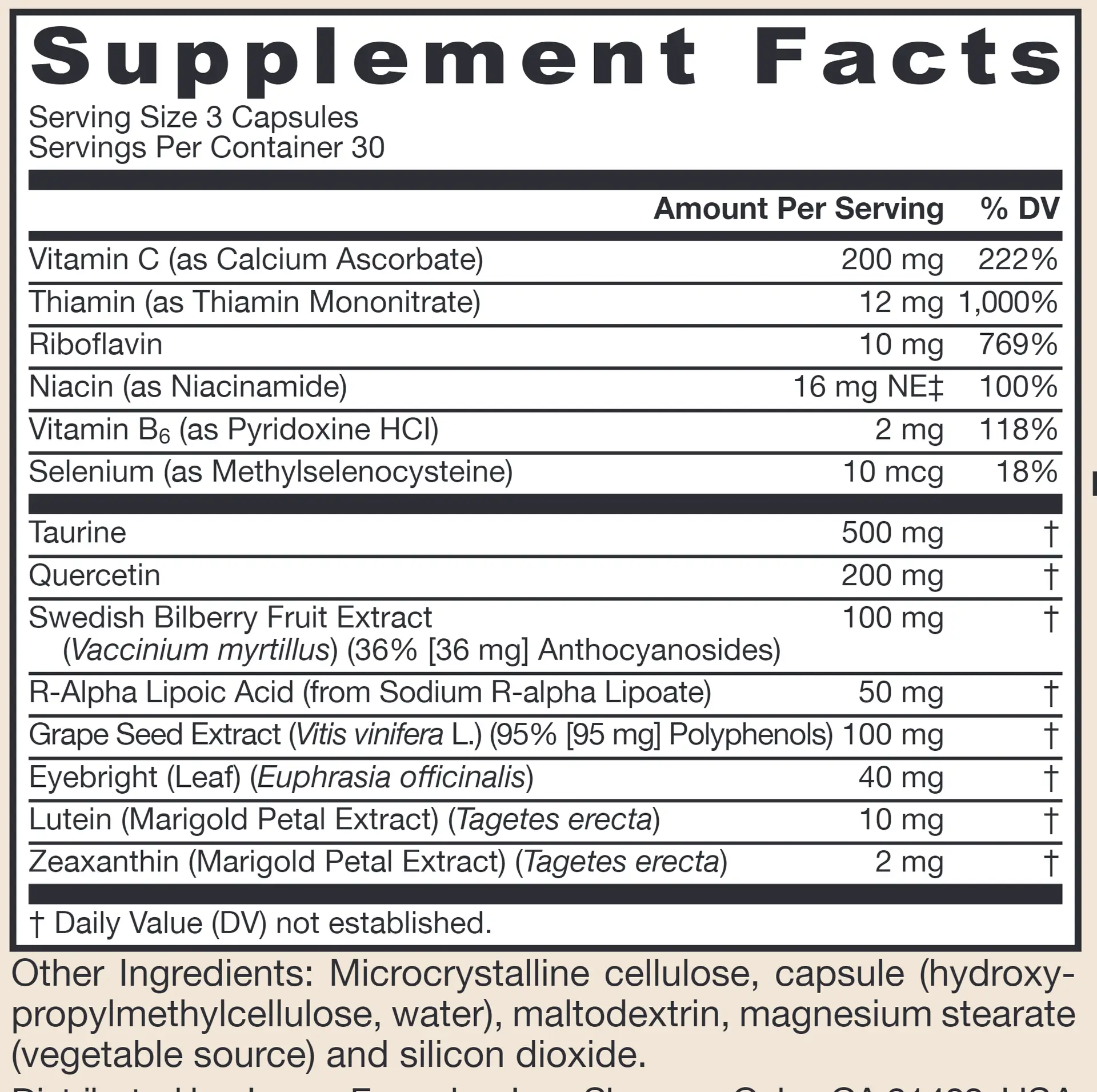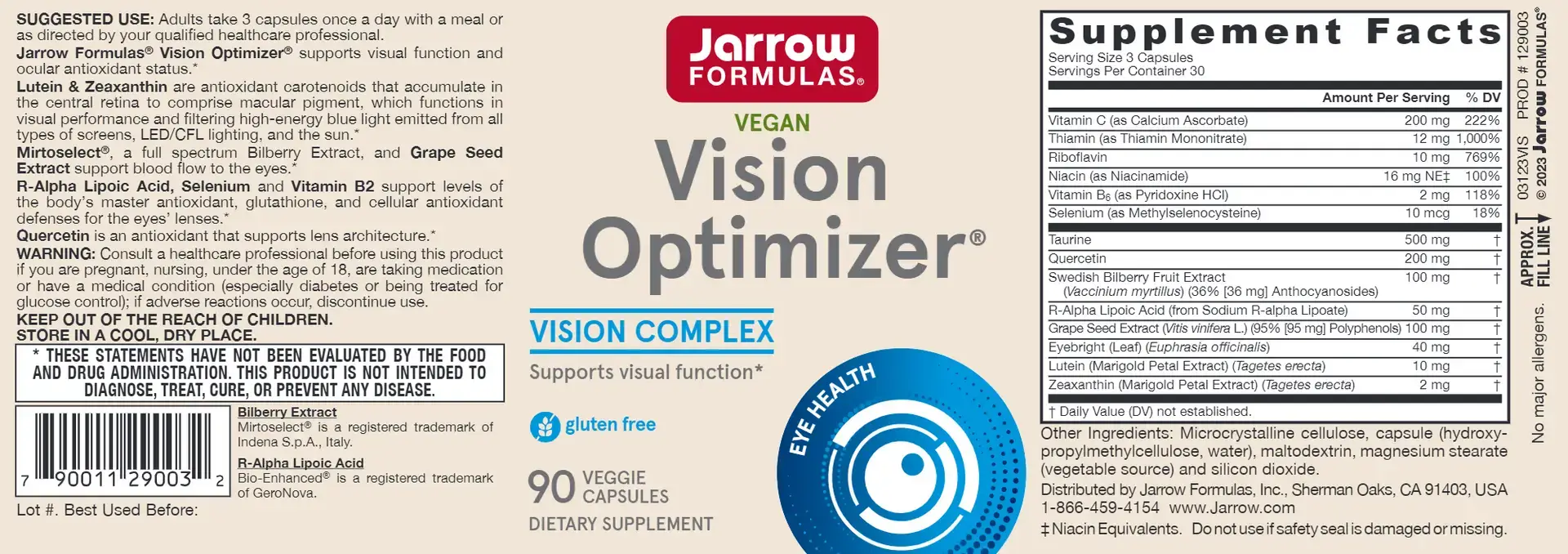 “Jarrow Formulas® Vision Optimizer® supports visual function and ocular antioxidant status.* Lutein & Zeaxanthin are antioxidant carotenoids that accumulate in the central retina to comprise macular pigment, which functions in visual performance and filtering high-energy blue light emitted from all types of screens, LED/CFL lighting, and the sun.* Mirtoselect®, a full spectrum Bilberry Extract, and Grape Seed Extract support blood flow to the eyes.* R-Alpha Lipoic Acid, Selenium and Vitamin B2 support levels of the body’s master antioxidant, glutathione, and cellular antioxidant defenses for the eyes’ lenses.* Quercetin is an antioxidant that supports lens architecture.*”